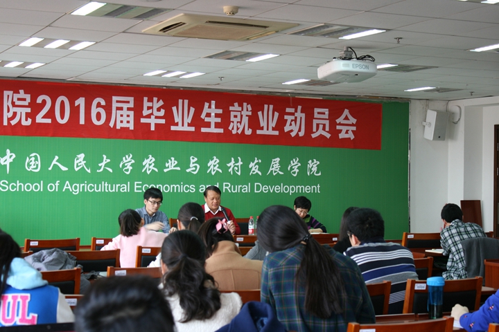 2016-03-073月2日下午,2016届毕业生就业动员大会在明德主楼930顺利举行,我院院长唐忠教授、党委书记张利庠教授出席了此次会议,党委副书记康琳老师主持了会议,我院2016届应届毕业生参加会议。