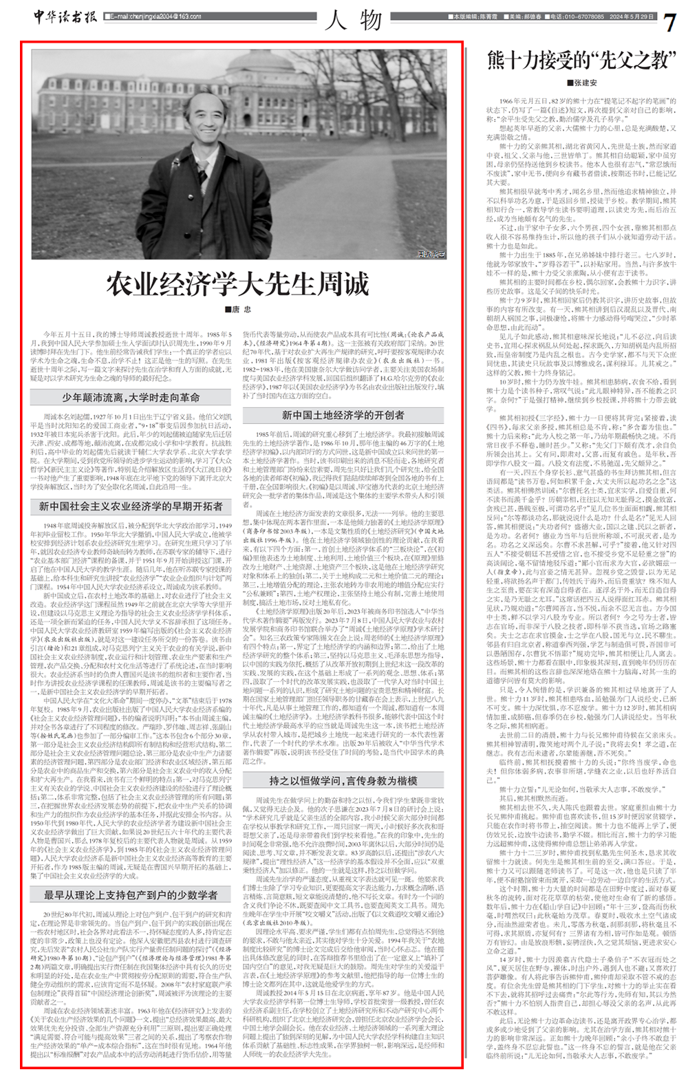 2024年5月29日,中华读书报人物版刊出了我院原院长唐忠教授撰写的“农业经济学大先生周诚”,这既是对我院第一位博士生导师周诚逝世十周年的一个纪念,更是中国人民大学农业经济系建系七十周年农业与农村发展学院建院二十周年学科发展的一个历史见证,特转发此文。