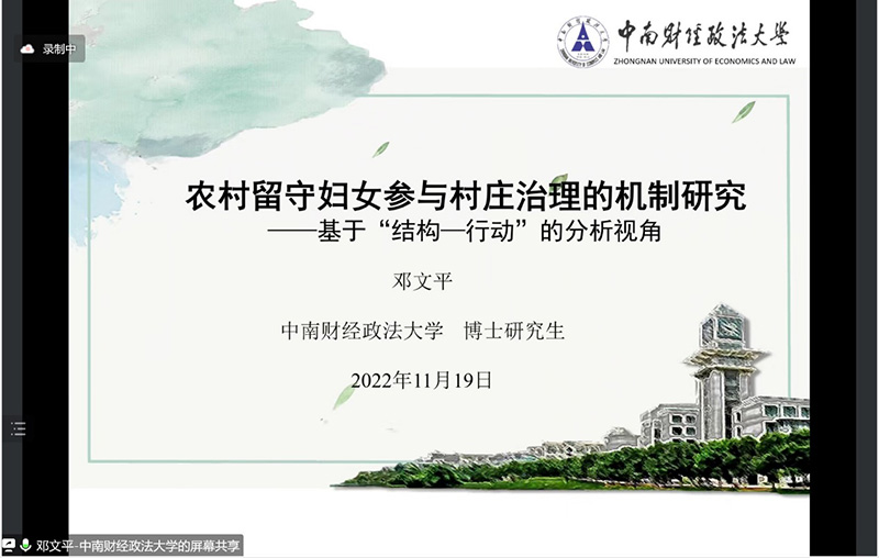 优秀论文报告环节由中国农村发展学会青工委秘书长、乐竞体育平台官方网站副教授陈威主持。中国农村发展学会青工委副秘书长、乐竞体育平台官方网站助理教授孔祥雯,乐竞体育平台官方网站助理教授余嘉玲担任评论人。本论坛前期以“乡村人才振兴”为主题进行征文,共收到来自全国各地高校、科研机构与政府单位的论文投稿40篇。经过专家匿名评审打分,最终遴选出2篇优秀论文进行现场报告。来自中南财经政法大学法学院的博士生邓文平汇报了论文“农村留守妇女参与村庄治理的机制研究”。来自中国农业大学人文与发展学院的博士生李航汇报了论文“人才下乡:乡村职业经理人经营村庄的互动困境及其纾解基于地方实践案例的比较分析”。