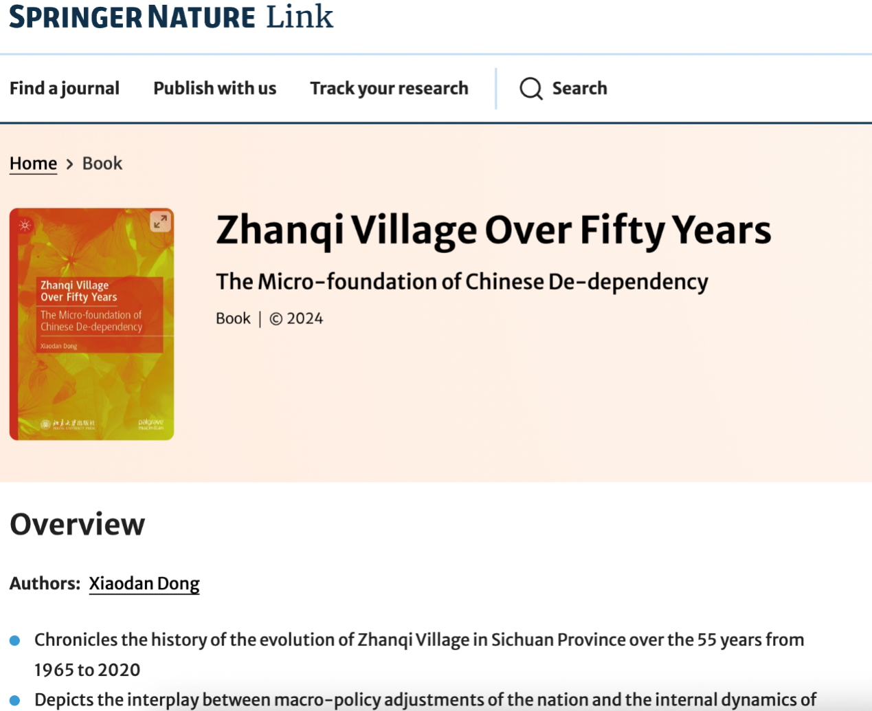 我院董筱丹副教授的学术著作《Zhanqi Village Over Fifty Years: The Micro-Foundation of Chinese De-dependency》近日由施普林格·自然(Springer Nature)出版集团旗下的帕尔格雷夫·麦克米伦(Palgrave Macmillan)正式出版发行。