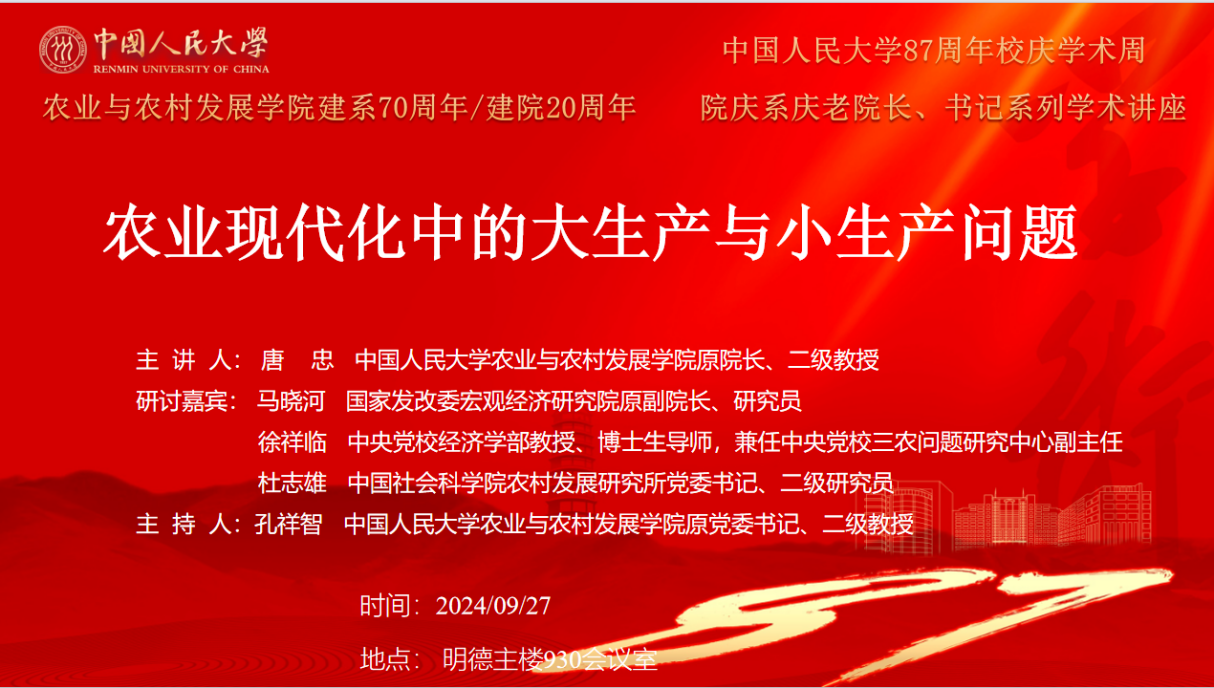 2024年9月27日下午,农业与农村发展学院建系70周年/建院20周年院庆系庆老院长、老书记系列学术讲座第一讲——“农业现代化中的大生产与小生产问题”在明德主楼930会议室成功举办。本次讲座是学校87周年校庆学术周的系列活动之一。