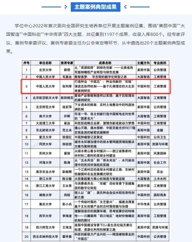 为进一步深入贯彻落实习近平总书记对哲学社会科学工作和研究生教育工作的系列重要指示精神,落实《面向2035高校哲学社会科学高质量发展行动计划》《关于深入推进学术学位与专业学位研究生教育分类发展的意见》等文件要求,更好地推动高水平案例研究和教学,教育部学位中心展开一系列活动。除了推动典型案例成果的示范带动作用,教育部学位中心还以“名企+名家”为主要模式,推出首批企业案例研究基地活动,开展深层次、多角度、系统化案例开发,总结中国企业经验、讲好中国企业故事、提出中国企业方案、提炼中国企业模式研究。我院张利庠教授被聘为首批企业案例研究基地的首席专家。