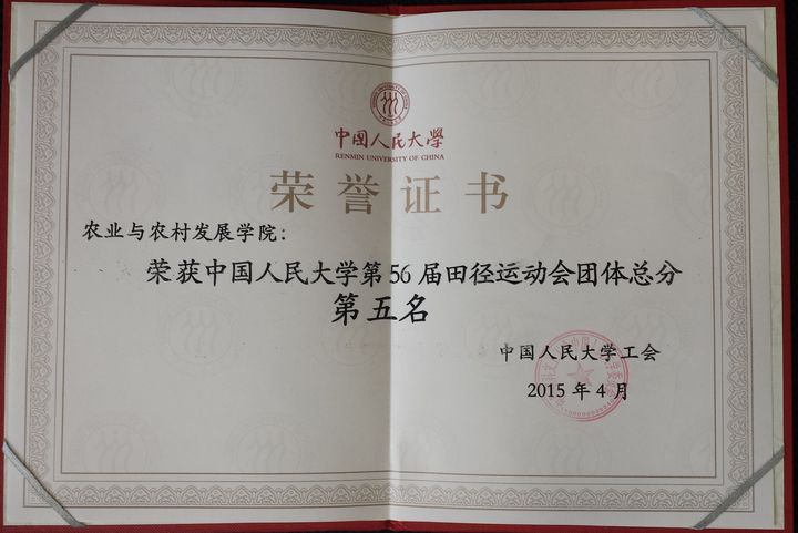 2015年4月15和17两日,中国人民大学第56届田径运动会在学校田径场举办,我院教职工参加了5项团体项目(滚铁环接力、运球接力、背夹球接力、沙包掷准、100米接力)和15项个人项目(立定跳远、铅球、掷实心球、100米跑等)的比赛。学院教职工在比赛中积极配合、努力拼搏,展示了农发人的风采,体现了团队精神、享受了运动的乐趣。在大家的共同努力下,我院沙包掷准获得第4名,个人项目有8项进入前8名,在42个教工参赛队伍中获得了团体总分第五名,取得我院参赛以来的最好成绩。