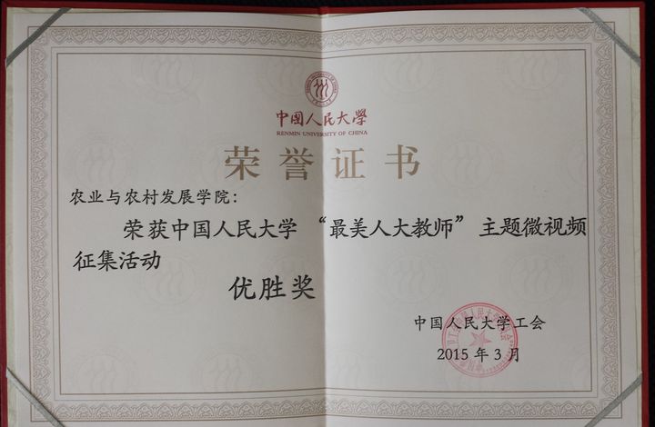 2015-04-23在学校领导的大力支持和关怀下,在学院广大教职工的努力下,我院获得2014年度中国人民大学“先进分工会”,同时获得了中国人民大学“最美人大教师”主题微视频征集活动优胜奖。