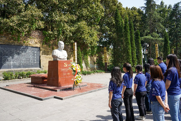在参观完展览馆后,实践团师生来到吴玉章故居。实践团师生瞻仰墓地并敬献花篮。随后,实践团师生走入吴玉章故居参观。一件件展示陈列的遗物、一张张灰白模糊的照片、一段段细致深入的讲解,让实践团成员的思绪飘回到过往的尘封岁月里,仿佛看到了那个意气风发的少年,“愿意以我全部的力量献给全国同胞,为民族的解放为国家的独立的战争,而奋斗到最后一滴血”的誓言也在耳畔响起,那个身材魁梧、眼神坚定的革命志士仿佛穿梭过时光的隧道又站在了大家的眼前。